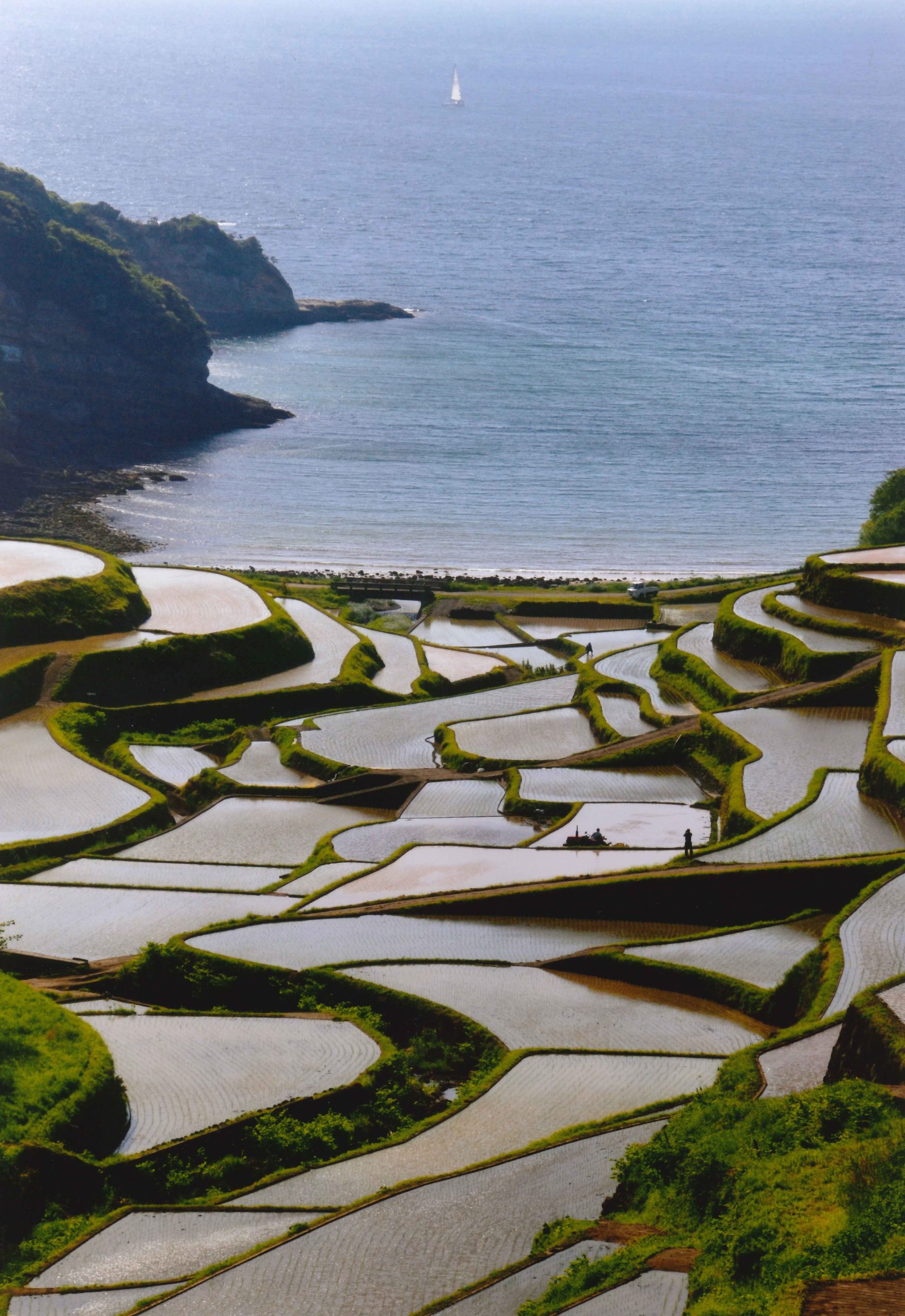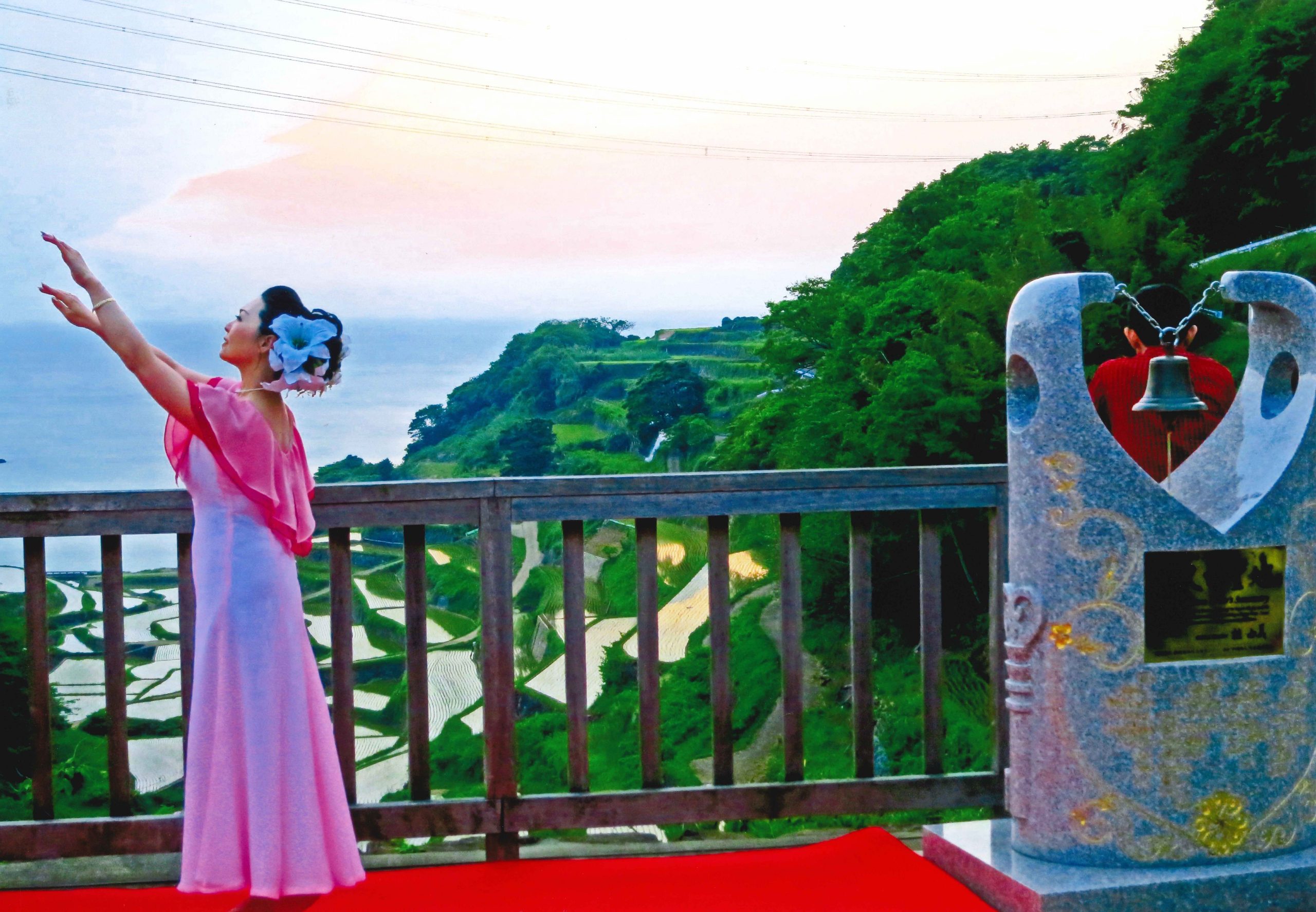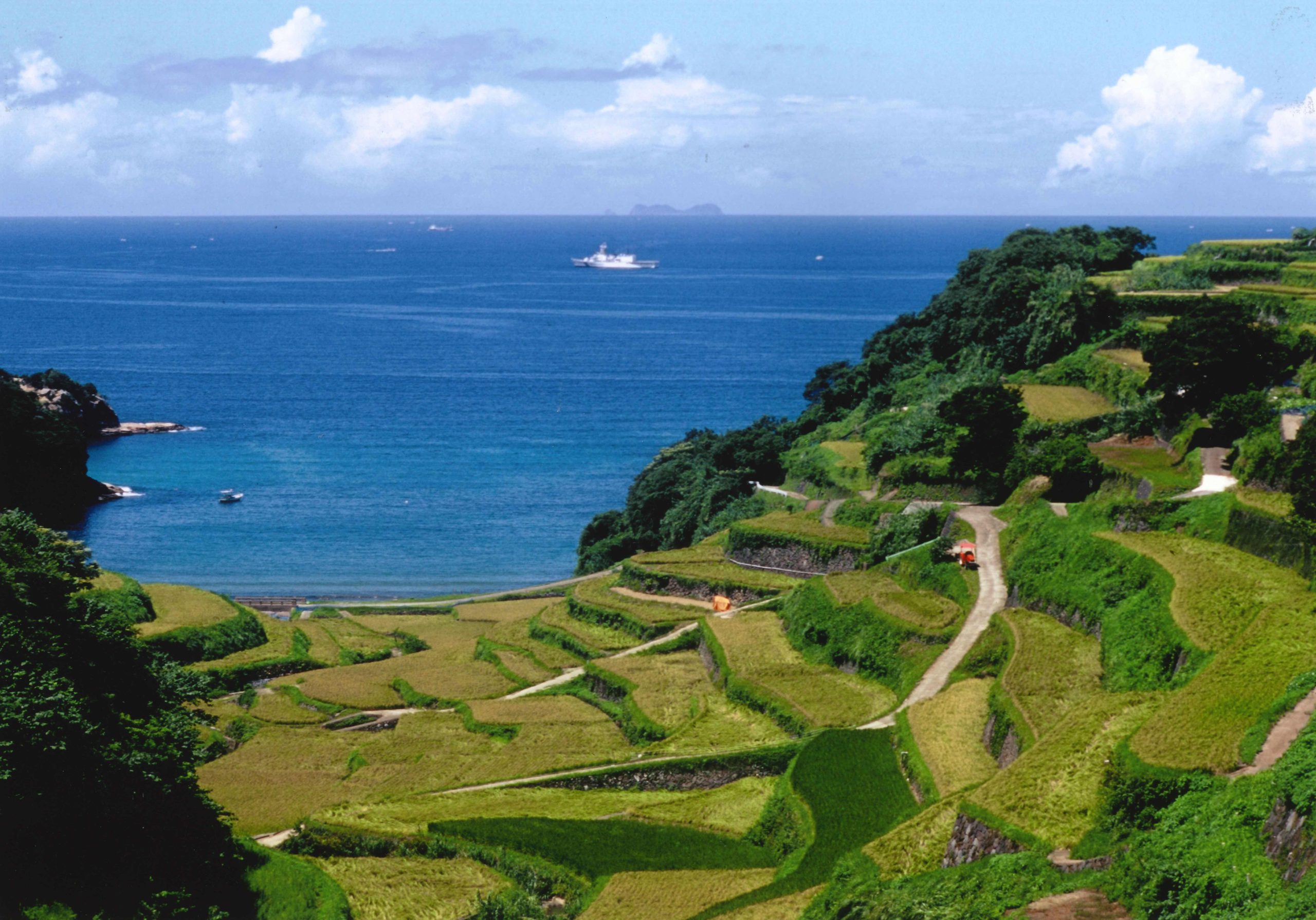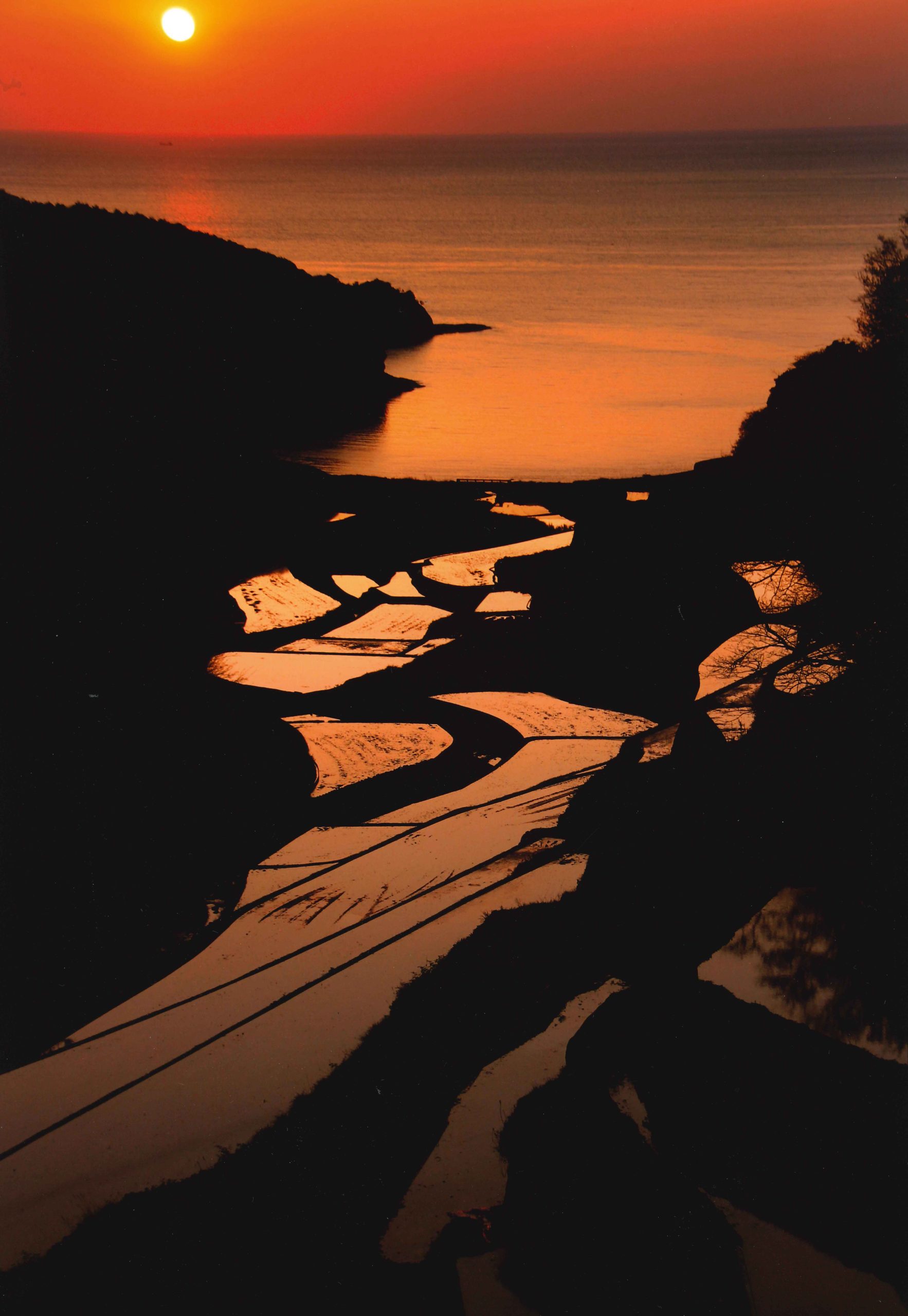 「春の棚田とオレンジ色の海」